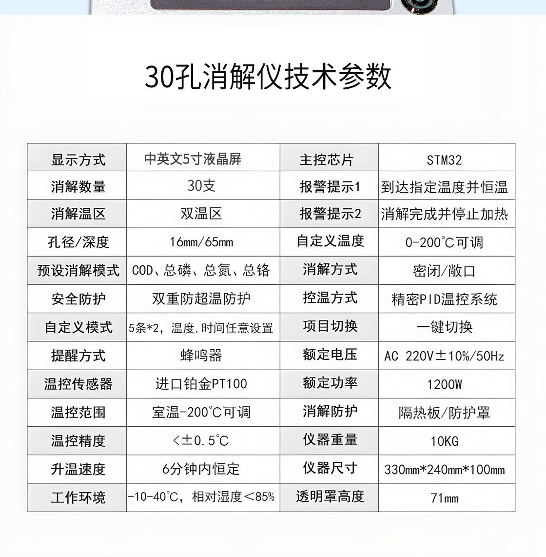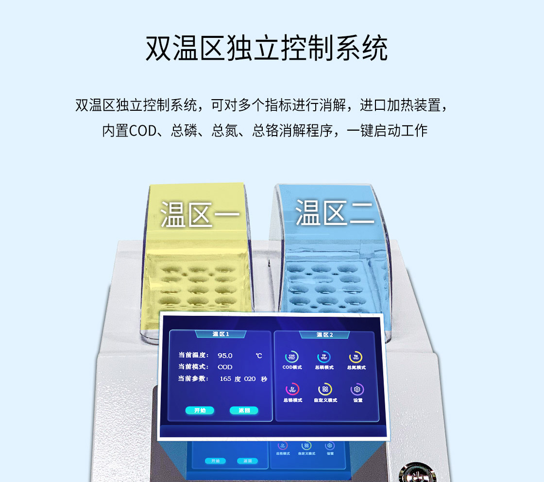 4 | 内置COD、总磷、总氮、总铬消解程序,无需设置一键启动工作。 |